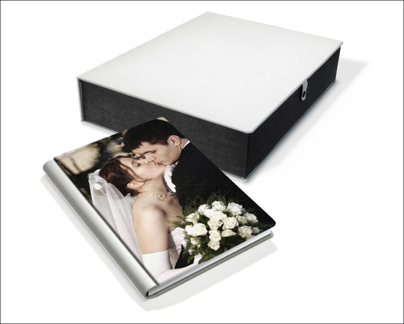 Copertina linea White con stampa fotografica lucidaLa parte frontale della copertina è stampata su carta fotografica plastificata lucida, Il retro è in pelle bianca pregiata con vanature.